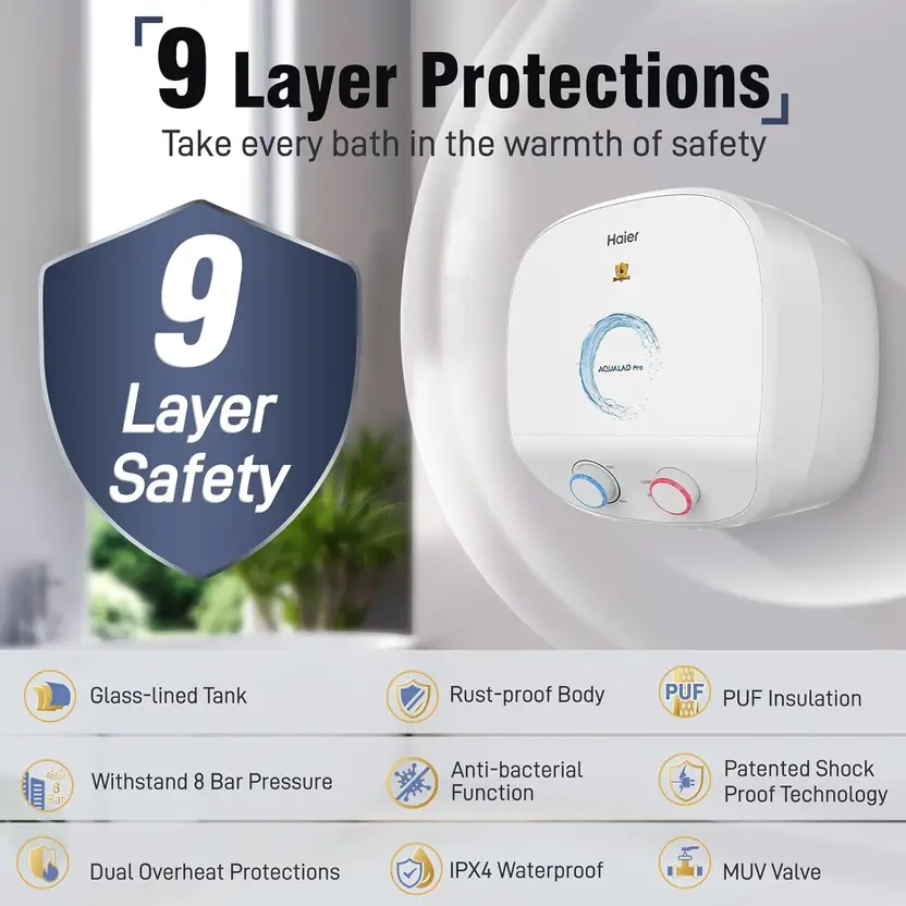 | Key Safety & Technology Features | Shock-proof, BPS, RSC Technology, 8 Bar Pressure, TTS Technology, PUF/EPS Insulation, MUV Valve, Superior Water Resistance(IPX4), Incoloy 800 Element |