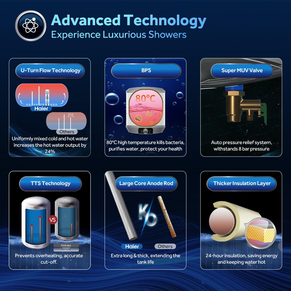 | Key Safety & Technology Features | Shock-proof, BPS, RSC Technology, 8 Bar Pressure, TTS Technology, PUF/EPS Insulation, MUV Valve, Superior Water Resistance(IPX4), Incoloy 800 Element |